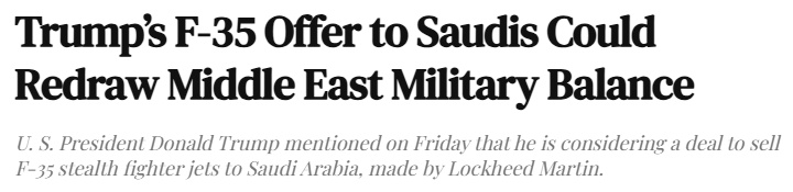 欧洲网站《现代外交》文章认为,特朗普向沙特出售F-35战斗机的提议可以恢复中东地区的军事平衡。