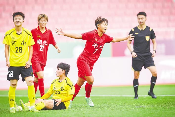 湖北女足由武汉车谷江女足组成。他们期间经历了“五线作战”的洗礼,体能面临严峻考验。此役对阵河南队,湖北队进行了适当的轮换:门将丁轩伤愈回归首发,秦曼曼也换下吕悦云。比赛开始后,湖北军很快控制了节奏。第7分钟,对方门将李晓旭主罚出现较大失误。球被邓梦野的身体折射,从横梁上弹回。王霜认球,抽射入网。 3分钟后,戴某断球直塞。他一脚决定性的射门,以2-0获胜。此后,宋端右路两次精准传中,助攻邓梦野头球攻门和王霜下一次突破。姚伟右路爆发,被传回底线。邓梦野接到球,同时转身射门。比赛不到25分钟,湖北军两人完成“双环”,以5-0提前锁定胜局。