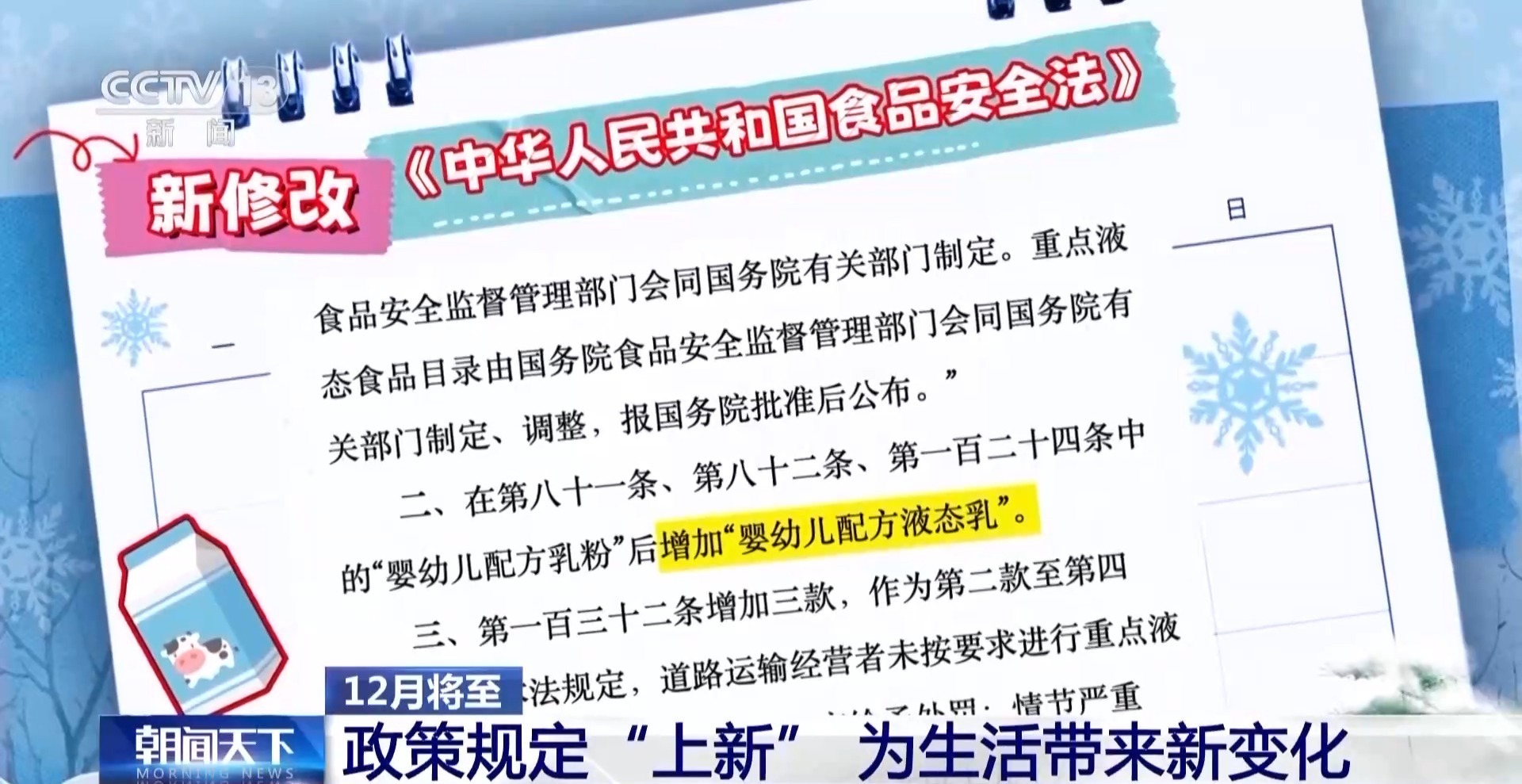 12月的第一个“新”来自于大家都离不开的餐桌。新修订的食品安全法将于12月1日起施行。此次,该法对液态食品的监管更加严格,对基本液态食品的大宗运输实行许可制度。让家家户户用得到的食用油、调味品从运输到配送的全链条可追溯。婴幼儿液态奶首次纳入注册管理。从锅里的油到瓶子里的牛奶,每一步都更加透明。